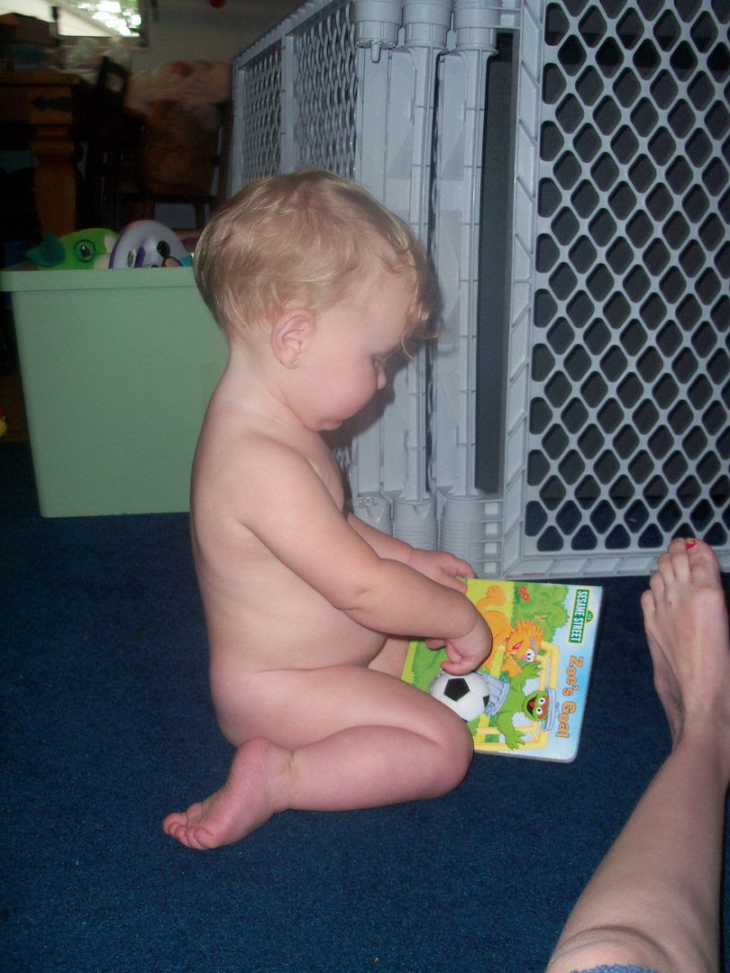 Like most other milestones she's on the fence about, her friends really encouraged her. They all love books. Riley has never harmed a book on purpose, except for one moment of frustration when she was teething. Sometimes she turns a page a little too enthusiastically, tries to move a piece of the pop-up image that doesn't move or wants to know where the fuzzy part of the book is coming from. She has never torn out pages, pulled covers off or colored in a book. She loves them and Mommy talks to her alot about not hurting books. Only 1/3 of her big brother's books survived his toodlerhood intact. He loves to read, but displays little respect for books themselves. I digress, Riley's friends all enjoy books.